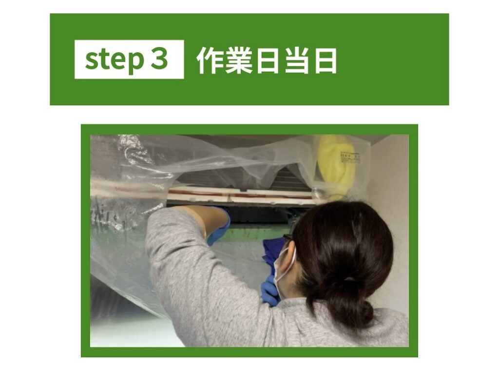 エアコン下には脚立を置いての作業となります。2畳分を目安にスペース確保のご協力をお願いいたします。